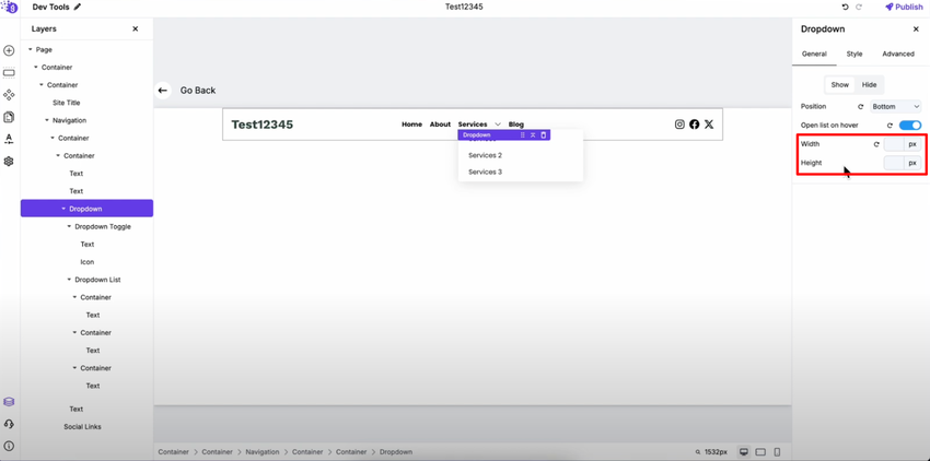 Toggle on "Open on Hover" for more responsive user experience that doesn't require clicking. Adjust width and height to ensure your dropdown content displays properly and maintains readability across different screen sizes.