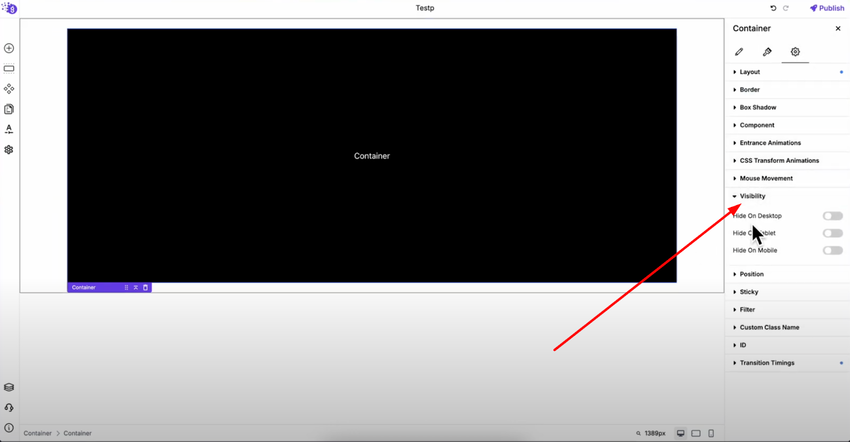 In the same advanced tab, you'll find visibility settings where you can choose to show or hide an element on desktop, tablet, or mobile. This is useful for creating device-specific layouts without affecting your overall design structure.