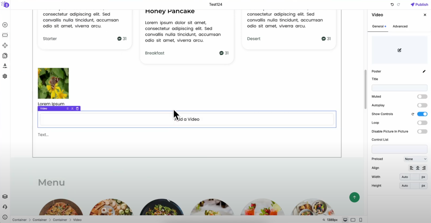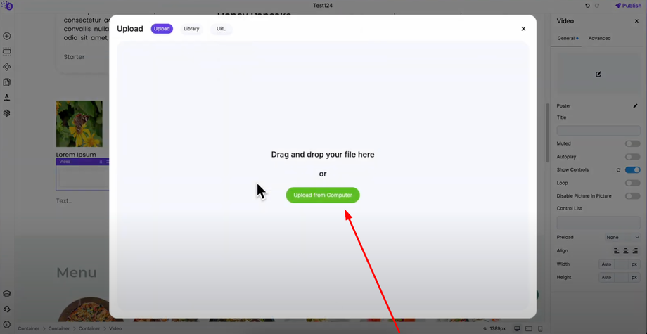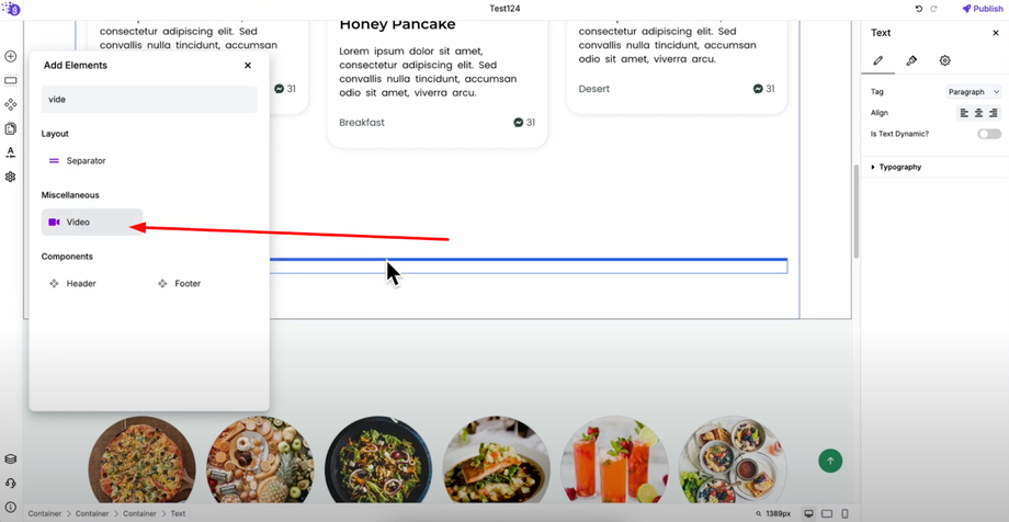 To add a video, search for "Video Block" in the elements list and drag it to your editor where you want video content to enhance your page engagement.