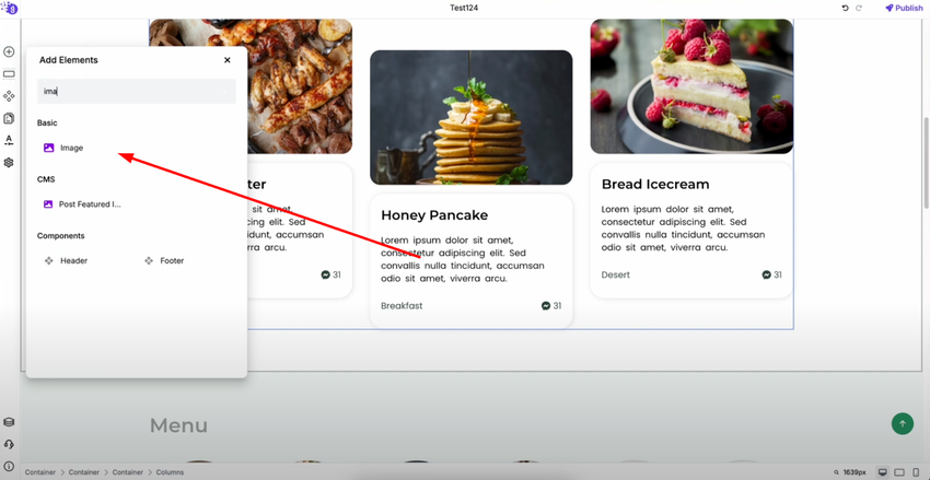 Open the Grigora editor and use the search option in the elements list to find "Image Block" and drag it into your editor where you want the image to appear in your content layout.
