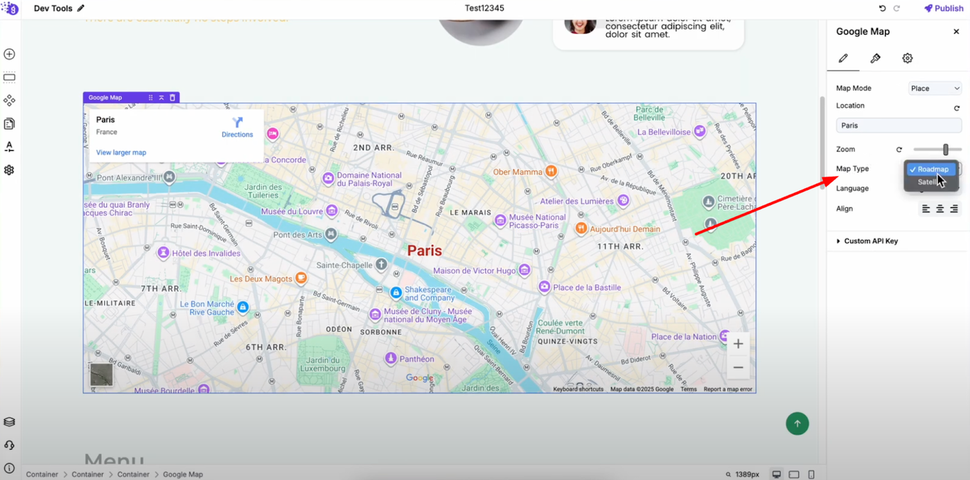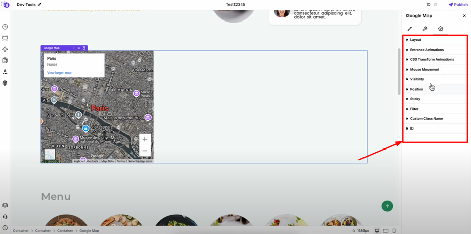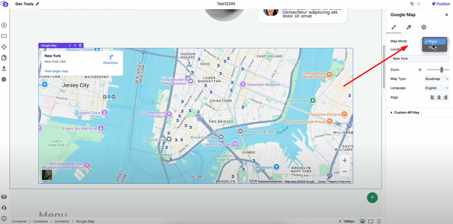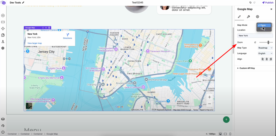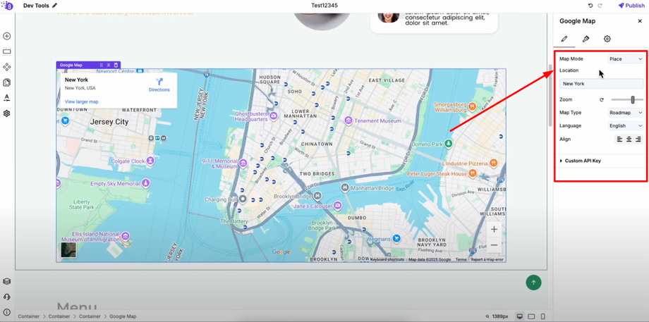 Drag and drop the Google Map element into the editor where you want the map to appear on your page. The map will appear with default settings that you can customize to match your specific needs.