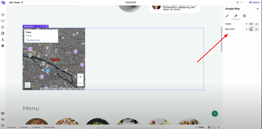 In style settings, you can customize the height and max width of the map block to ensure it fits perfectly within your page design and provides optimal viewing experience across different devices.