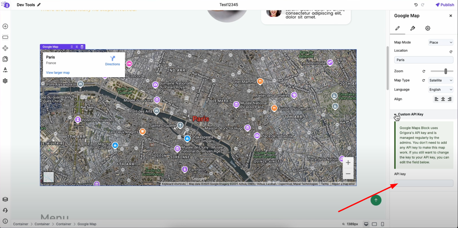 If you want, you can enter your own API key in the provided field if you have specific requirements, high traffic needs, or want to use Google Maps Premium features.