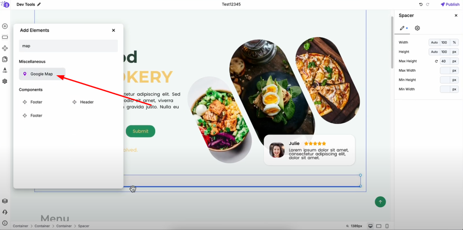 Open the Grigora site editor and navigate to the page where you want to add your map. Click on "Add Elements" to access the component library, then search for "Google Map" to find the mapping element.