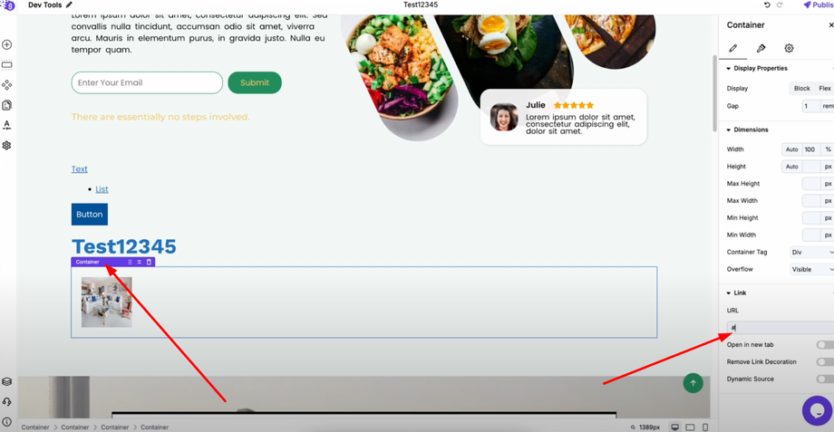 This container method works for any block in Grigora. Simply wrap any element in a container and add links through the container settings. This makes every element on your website clickable and functional.