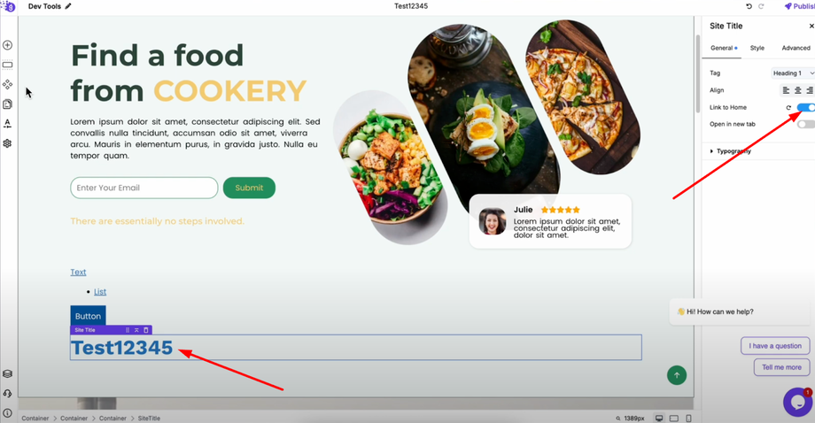 Select your site title and look for the "Link to Home" toggle in the settings. Enable this option to automatically link your site title back to your homepage - a common navigation practice.
