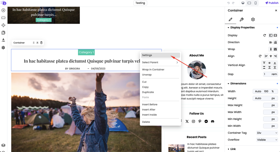 The settings panel will appear on the right-hand side. If it's not visible, right-click on the element and select "Settings".