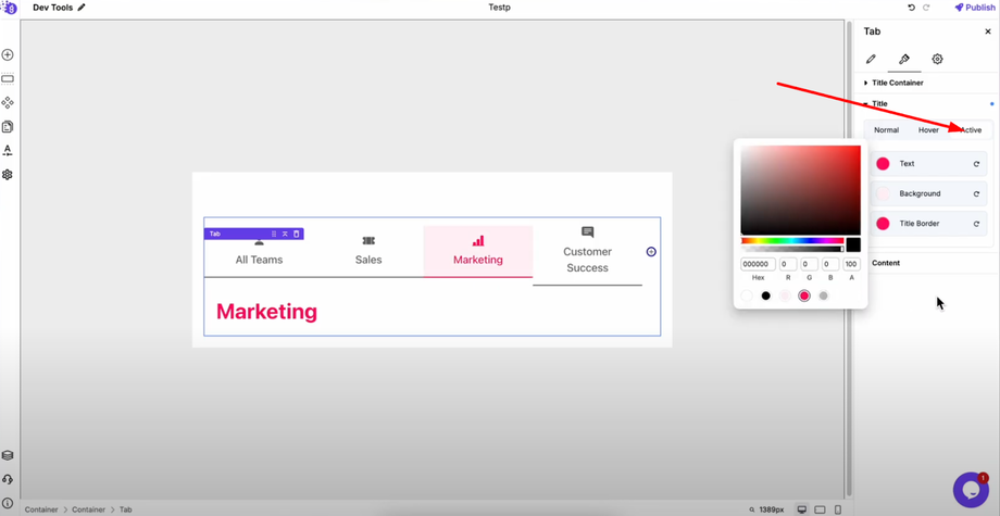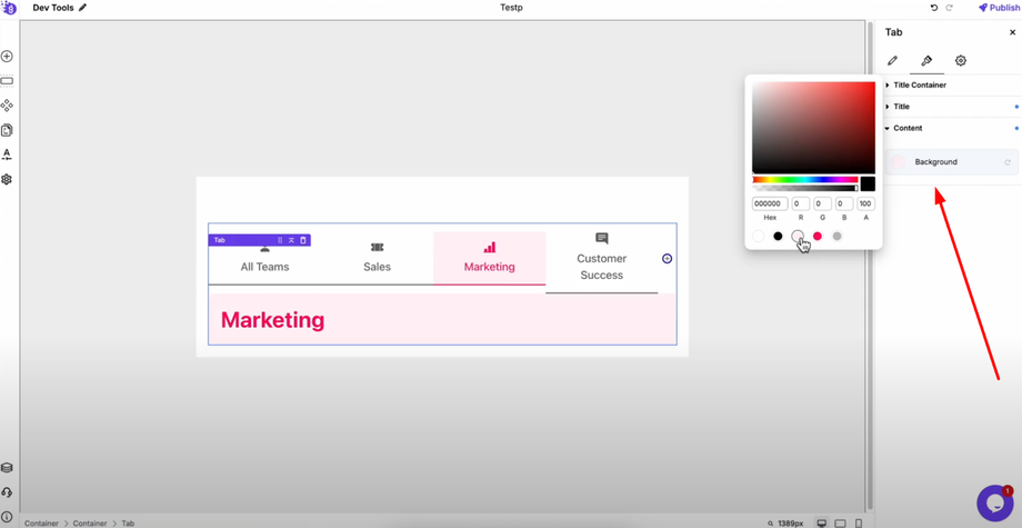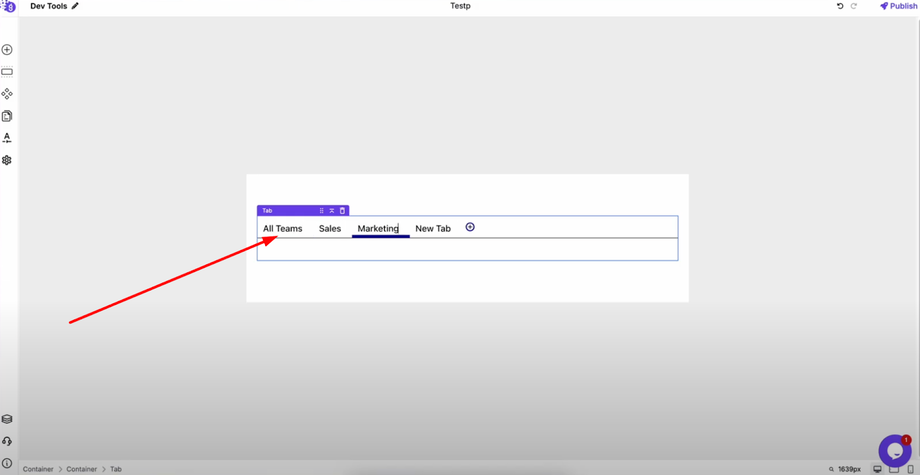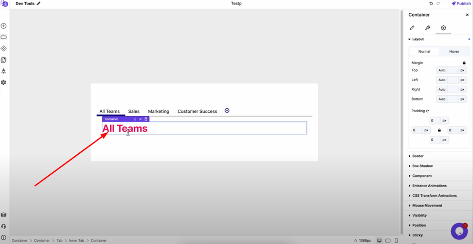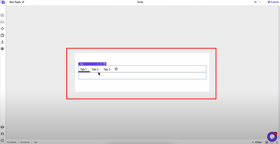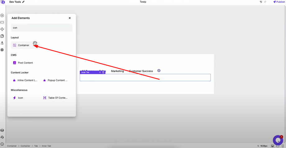 Open an inner tab to access its content area. Add a container as the foundation for your tab content. Add a text block inside the container for your primary content. Repeat this process for all tabs so each tab has its own organized content container