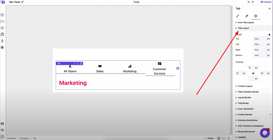 Title Layout: Open title layout and set padding for proper spacing around tab titles