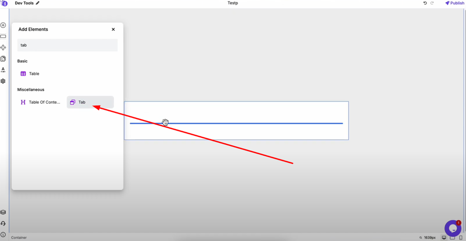 Open the Grigora editor and click on "Add Elements" to access the component library. Search for "Tab" and drag and drop the tab block into the editor where you want your tabbed content to appear.