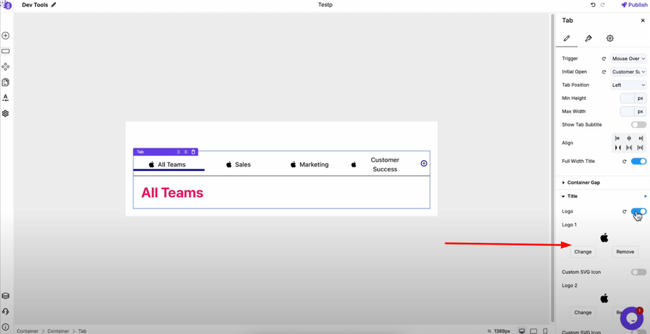 In the title section, toggle "Logos" on to display icons for each tab title, making your tabs more visually appealing and easier to identify.