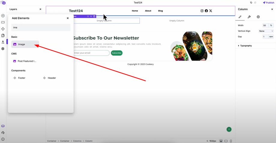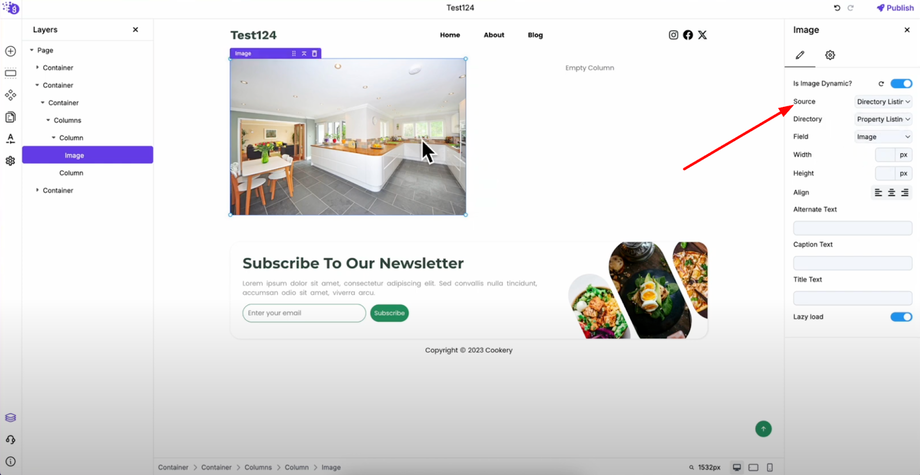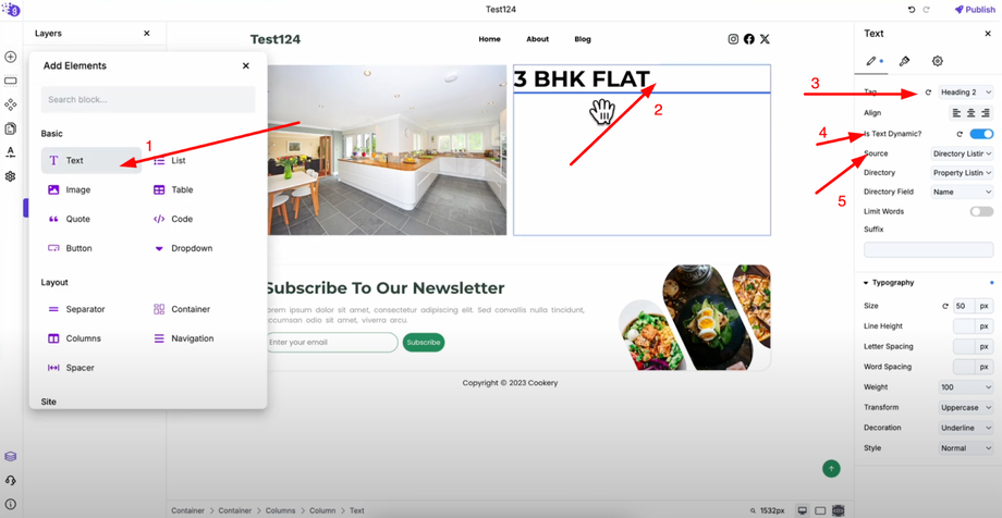 Add a text block to the right column and enable dynamic source for the text. Select your directory collection from source options and choose the name field from the directory field dropdown. Style the text by changing it to H2 heading and adjust font size and typography settings.