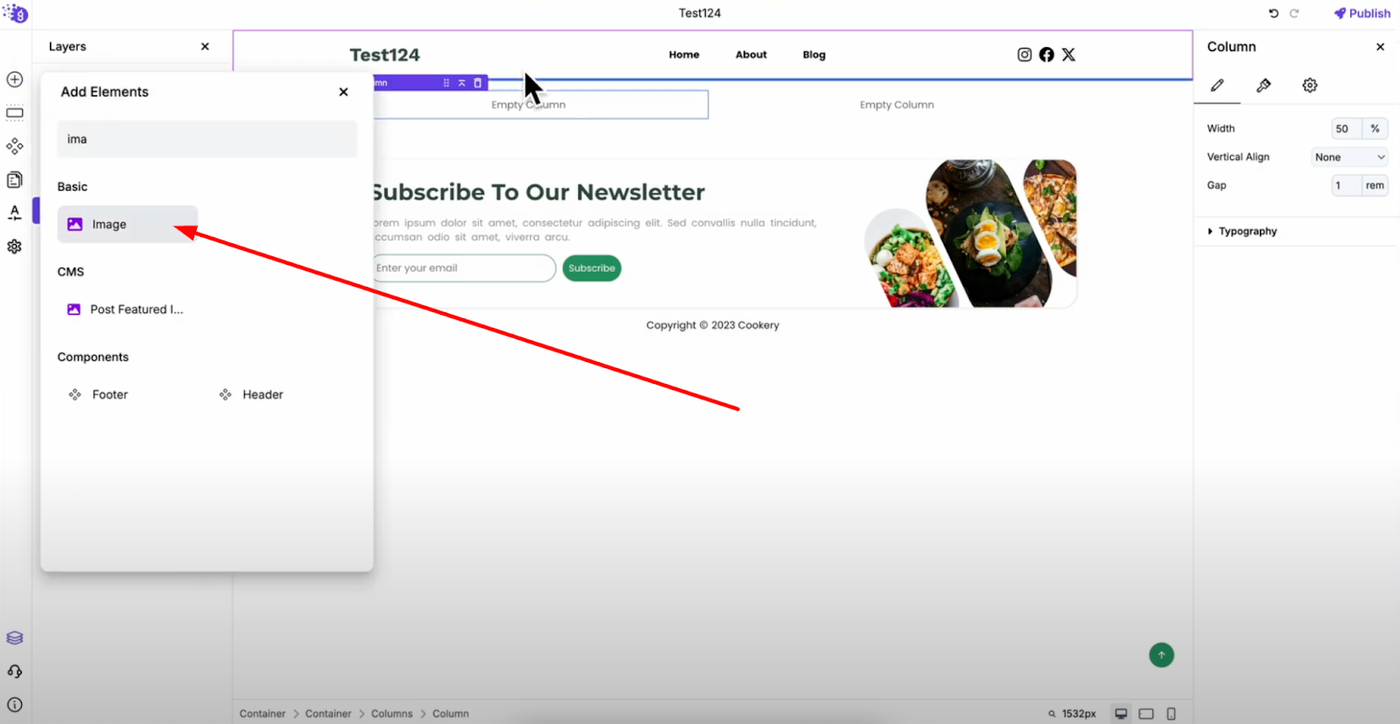Add columns element and add an image block to the left column and enable dynamic source in the image settings. The system will automatically detect your directory collection and connect to the image field, displaying different images for each directory item.