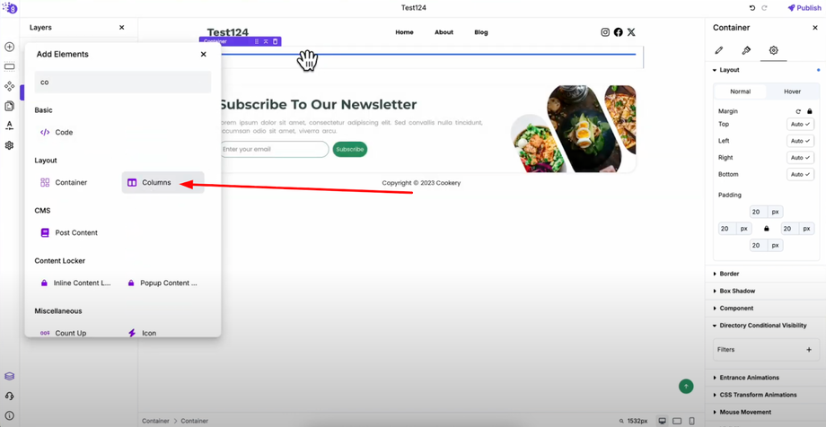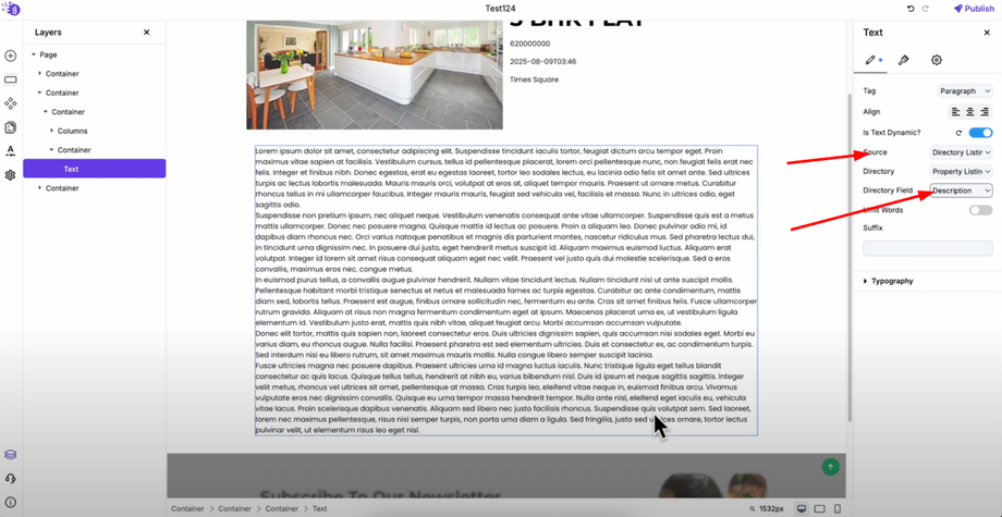 Add another container below your columns for additional content. Add a text block inside this container, enable dynamic source, and select the description field to display complete description content for each directory item.