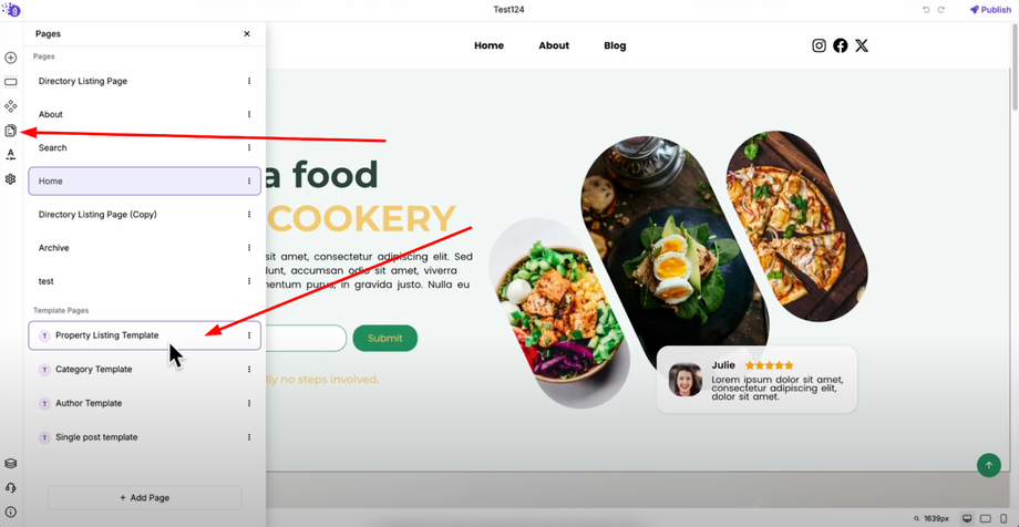 Click on "Pages" in the left panel to access your page templates section. When you create a directory collection in Grigora, the system automatically generates template pages for that collection. Look for your collection template in the pages list (for example, "Property Listing Template") and click on the template name to open it for editing.