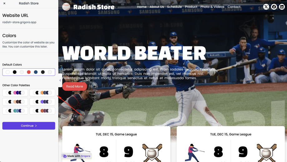 Color Palettes: Grigora offers a selection of 4-8 color palettes to choose from. Click on a palette that complements your theme and website's message.