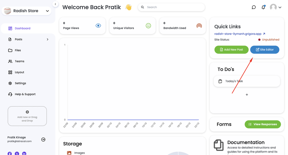 Open the Site Editor: Look for the card labeled "Site Editor" in the top right corner of your dashboard. Click on this card to access the powerful drag-and-drop interface.