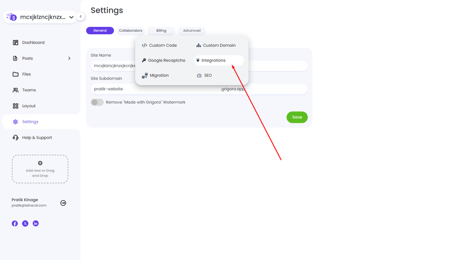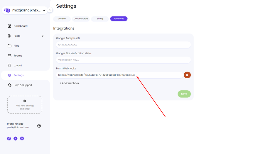 In the Form Integration URL field, paste the URL provided by your chosen webhook service. This is the URL where Grigora will send your form submission data.