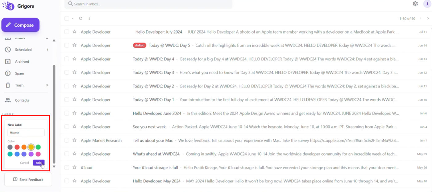 Enter a name for your new label and select a specific color to represent it. Click "Add" to save your new label (or "Cancel" if you change your mind).