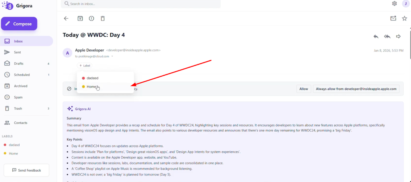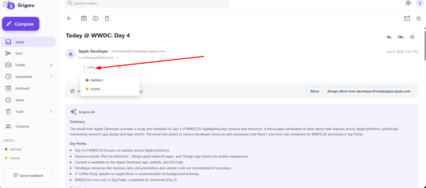 Under the sender's details, click the "+ Label" button to reveal a list of your existing labels.