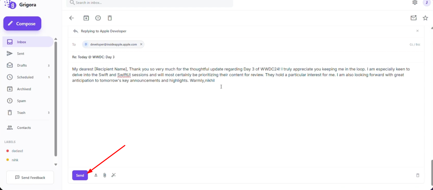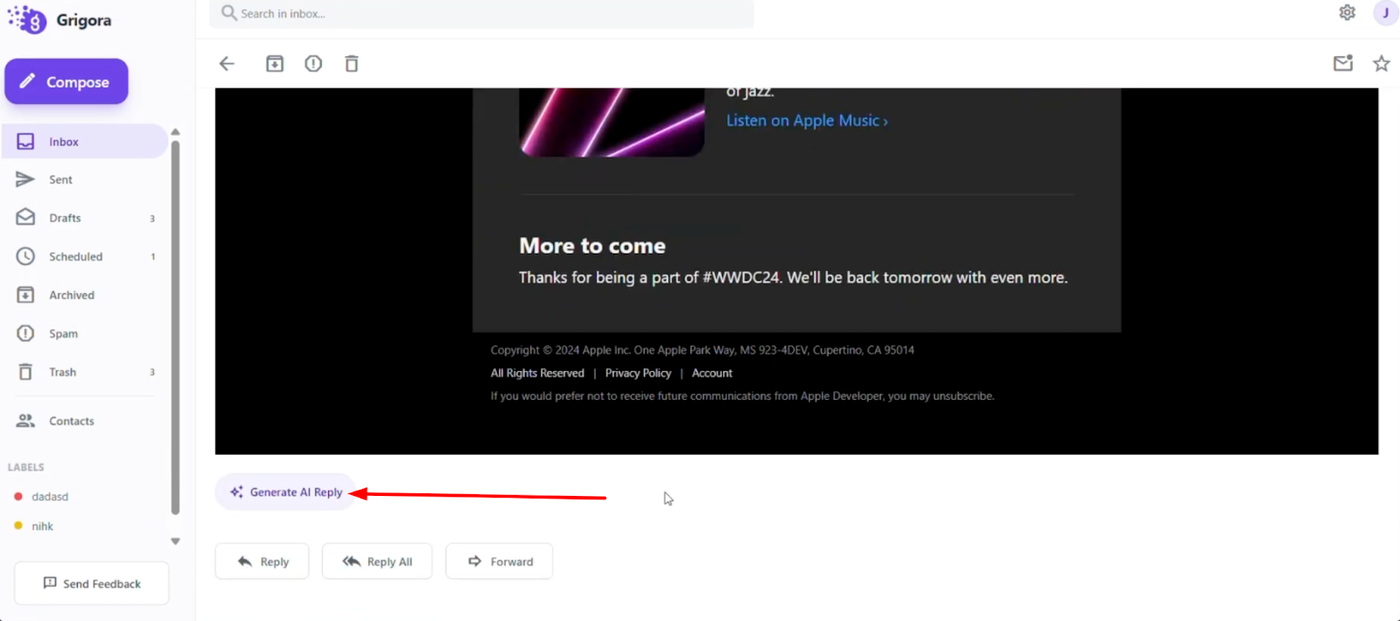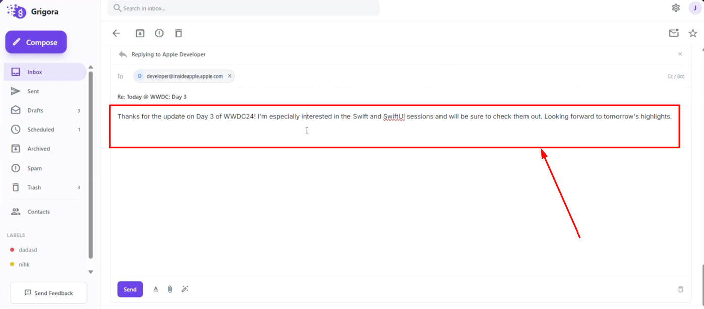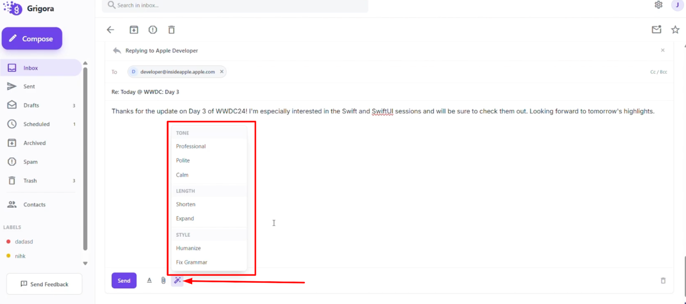 Learn how to instantly adjust the tone of your email responses using Grigora Mail's AI tools. This guide will show you how to generate replies and switch between professional, polite, or casual styles without rewriting the text yourself.