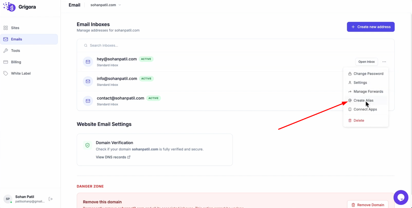 Learn how to create an email alias to manage different identities or purposes from a single inbox. This guide will show you how to add and delete aliases directly from your Grigora dashboard.