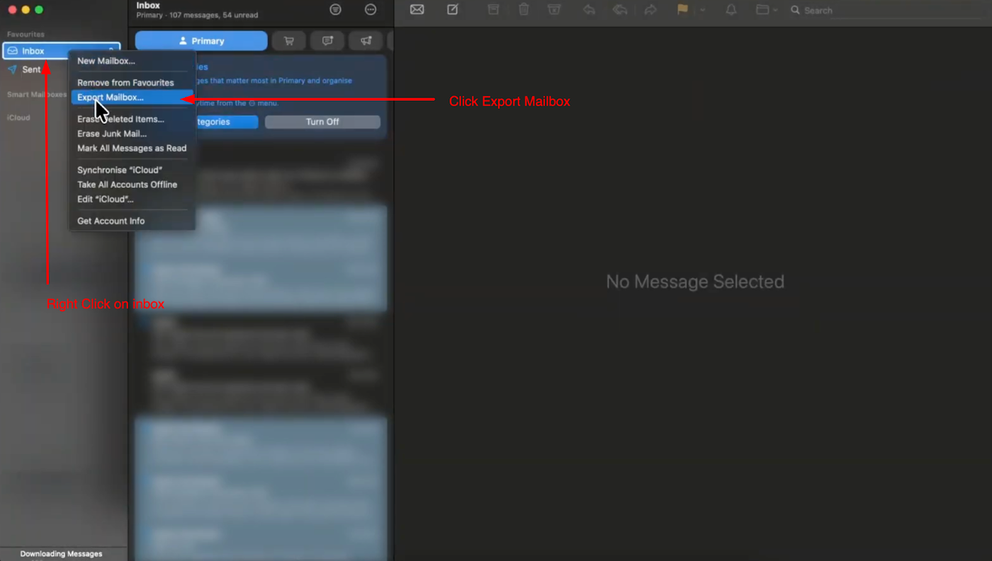 Right-click on the Inbox folder and select "Export Mailbox" from the menu options.