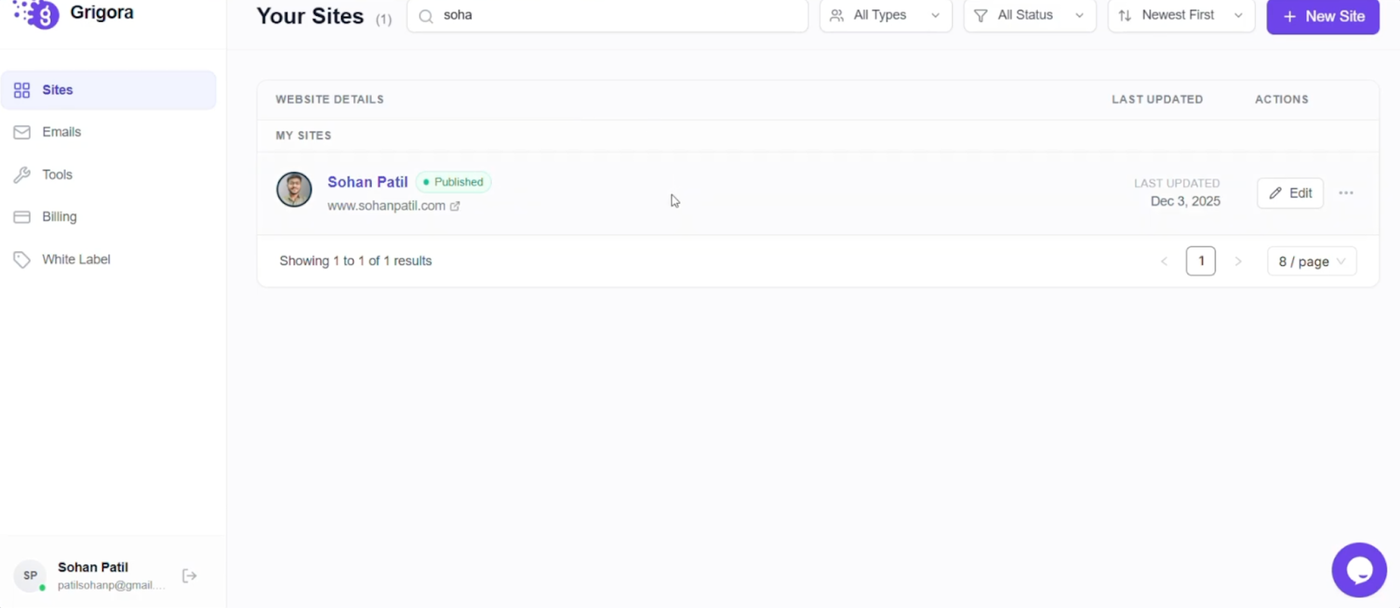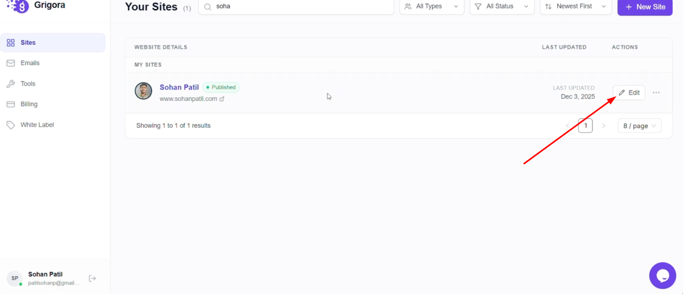 To make updates, find the "Edit" option on the right side opposite each site name. Click it to modify your site details directly from the dashboard.