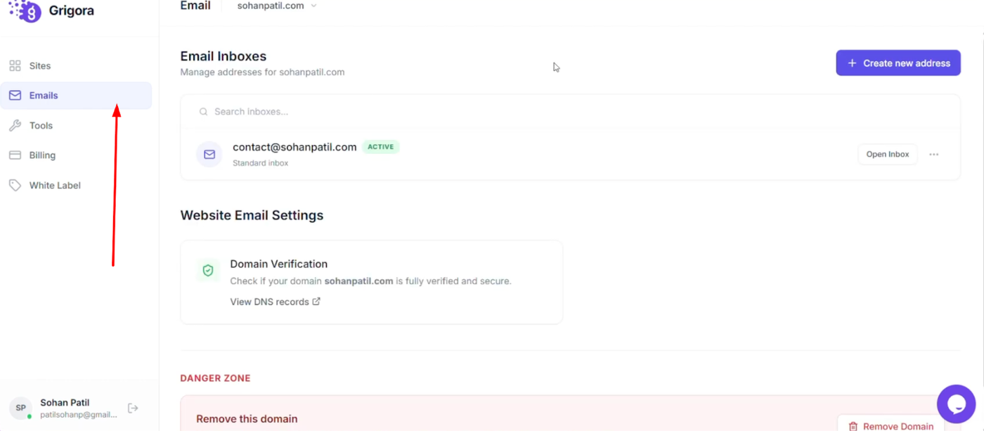 Switch to the "Emails" section to manage the communications for your projects. Here, you can view and control all mail details, including current mail addresses and connected domains.