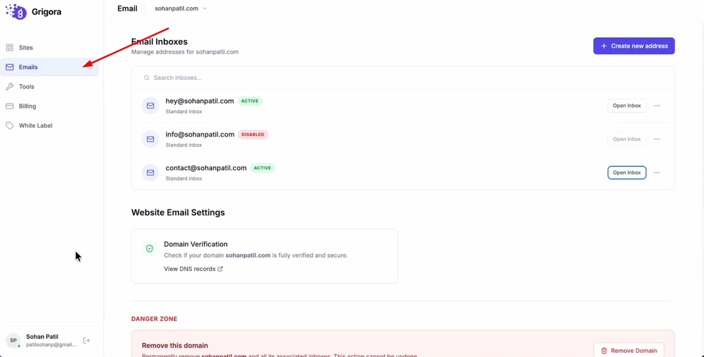 Log into your Grigora account and click on the "Emails" section from the dashboard.