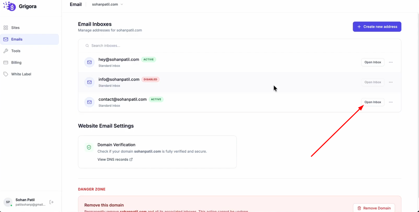 You will see a list of your created inboxes; select the one you wish to use and click "Open inbox" to launch the Grigora Mail interface and login with your credentials.