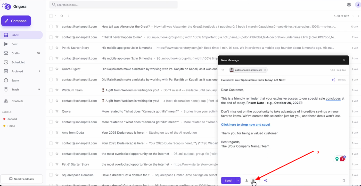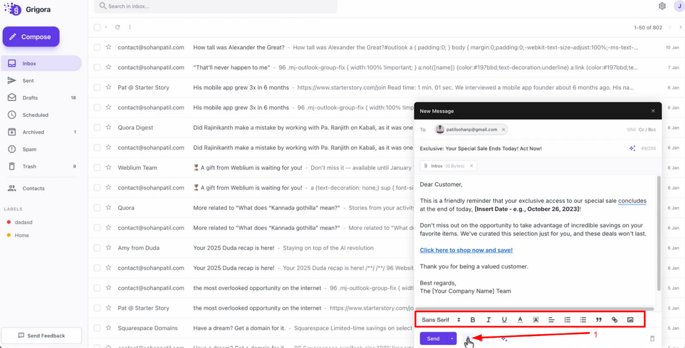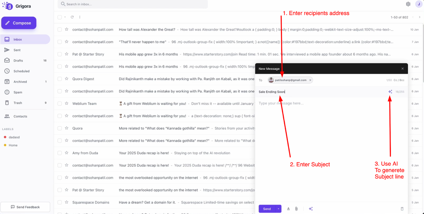 Learn how to compose and send professional emails directly from your Grigora Mail interface. This guide shows you how to access your inbox, utilize AI tools for subject lines and drafting, and send polished communications effortlessly.