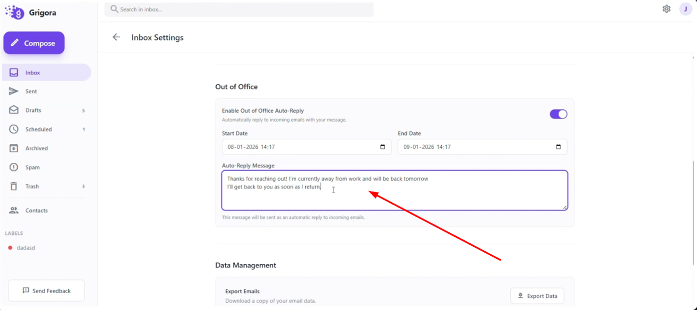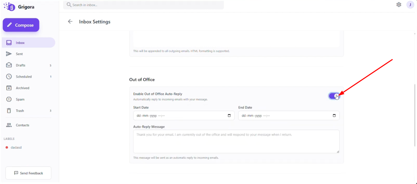 Scroll down the settings menu until you find the "Enable out of office auto reply" toggle. Switch this toggle on to activate the feature.