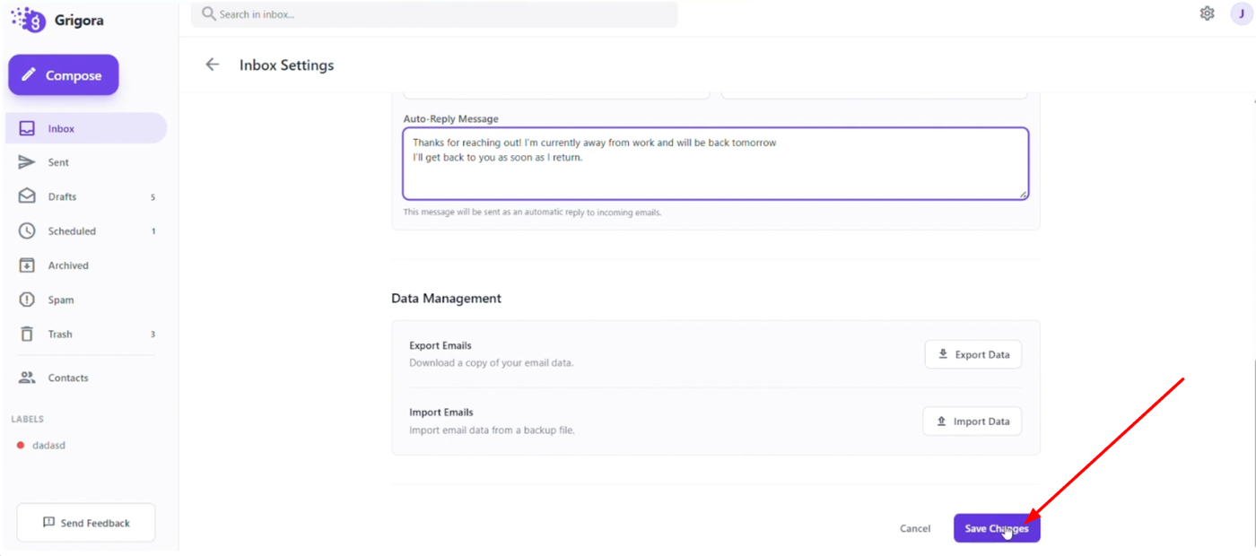 Once you have crafted your message, click "Save changes" at the bottom of the page to finalize your setup. Any emails received during your specified period will now automatically receive this reply.