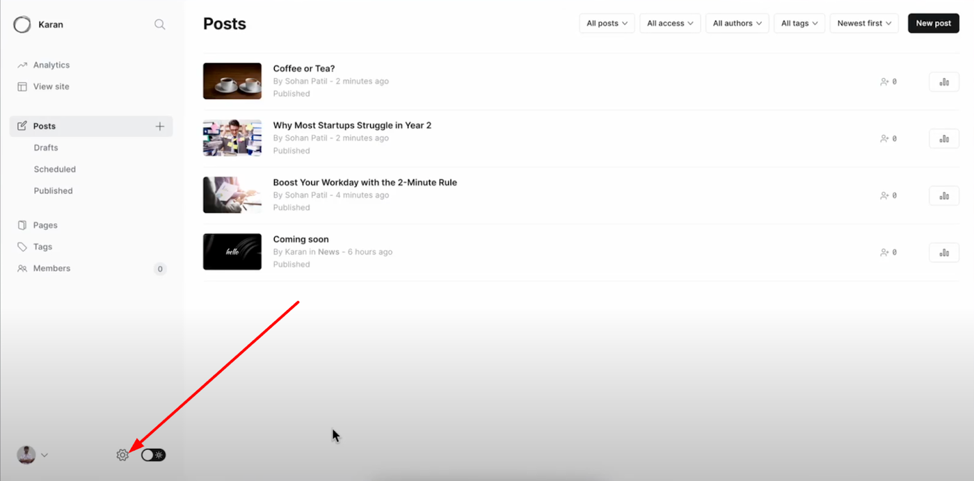 Log in to your Ghost account and navigate to your admin dashboard where you can access all site management tools. Click on "Settings" from the main navigation menu to access your site's configuration options.