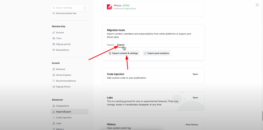 In the migration tools section, click on "Export" to begin the content export process. Click on "Export Content and Settings" to download a comprehensive package that includes all your posts, pages, tags, authors, and site settings.