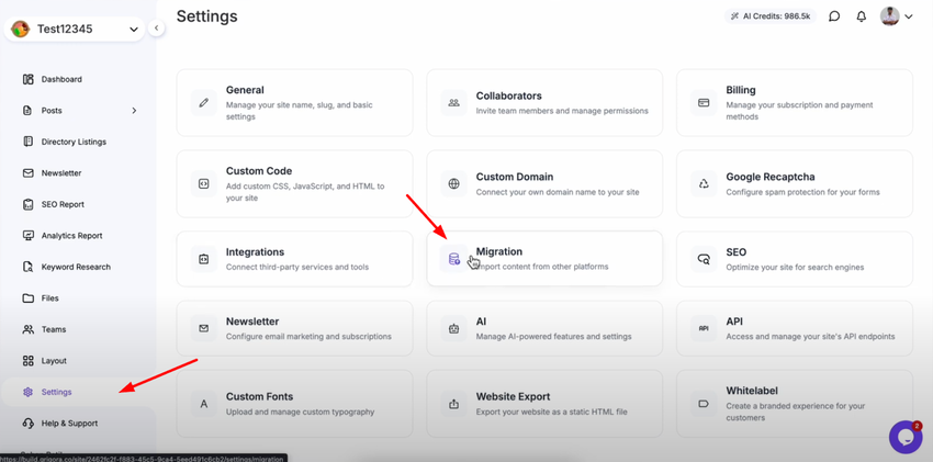Open "Settings" in the Grigora site dashboard from the left navigation panel. Go to "Migration Settings" to access Grigora's content import tools that support various platforms including Ghost.