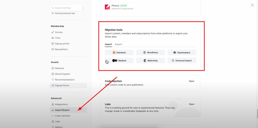 Scroll down through the settings menu until you find the import/export section. Click on "Import/Export" to access Ghost's content migration tools that allow you to export your entire site's content.