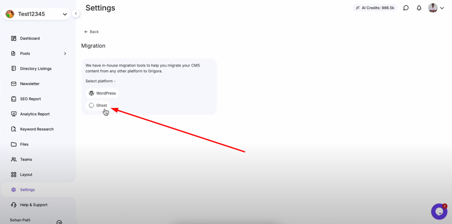Select "Ghost" as the migration source from the available platform options. This tells Grigora to expect Ghost-formatted content and use the appropriate import processes.