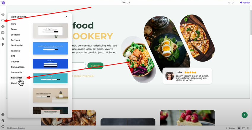 After opening the site editor, click on "Add Sections" in the left panel to access all available pre-made sections and elements. Click on "Newsletter" to view all the available newsletter signup form designs and layouts that come built-in with Grigora.