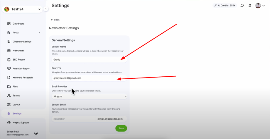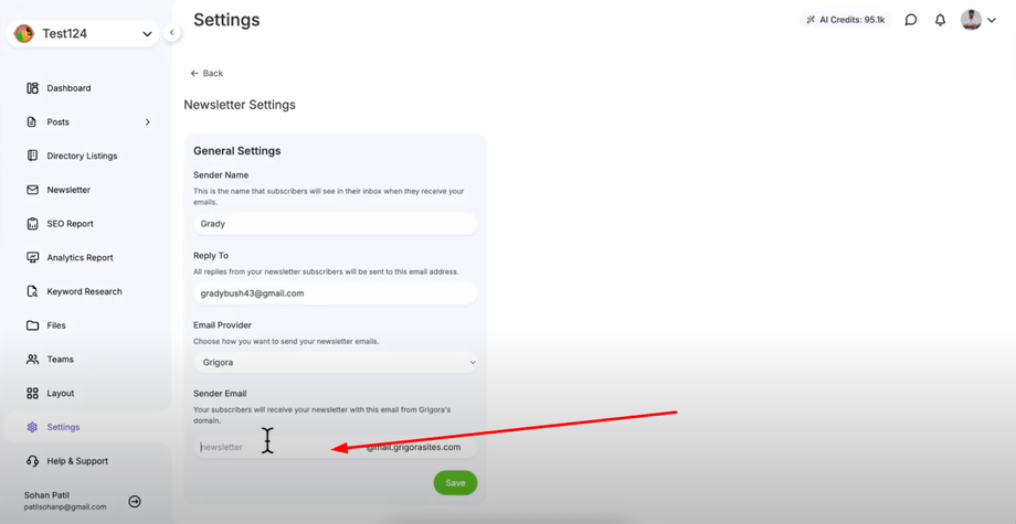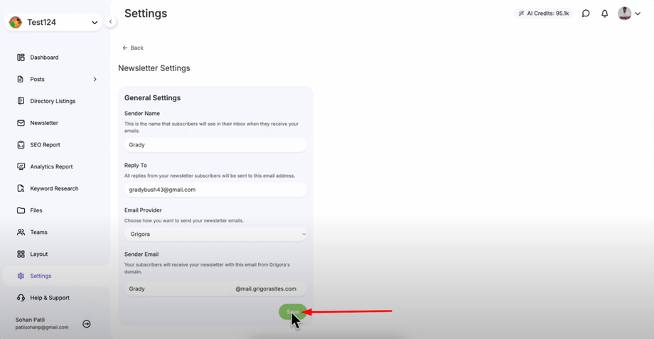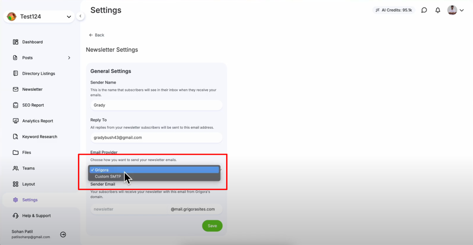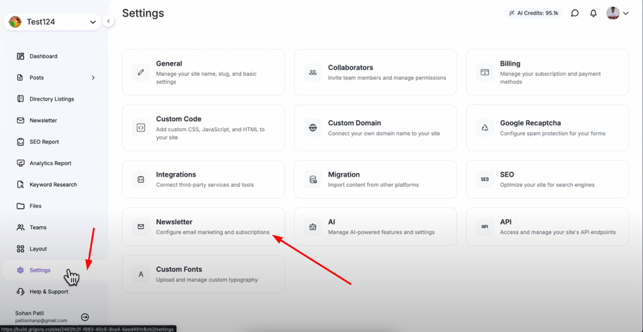 Go to your Grigora dashboard and click on "Settings" in the sidebar to access your site configuration options. Look for the "Newsletter" option and click on it to access all newsletter-related settings and configuration options.