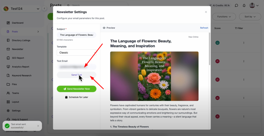 Before sending newsletters to your entire subscriber list, test your SMTP configuration. Go to "Posts" in your Grigora dashboard, select any blog post, and click "Send Newsletter".