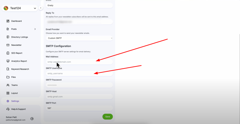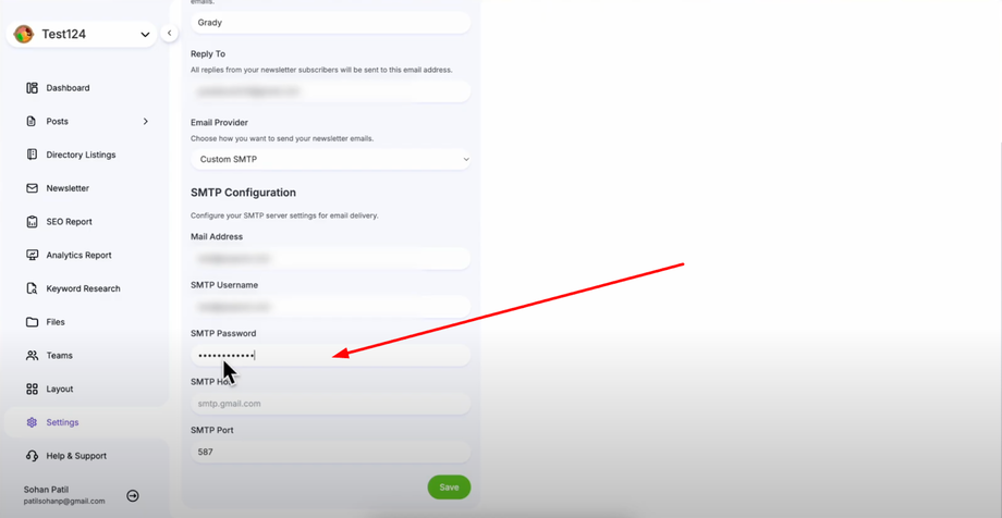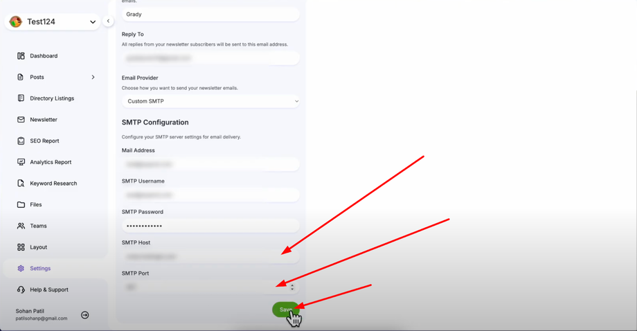 Input the SMTP server hostname and specify the SMTP port number required by your email service. Click "Save" to store your custom SMTP settings and make them ready for testing.
