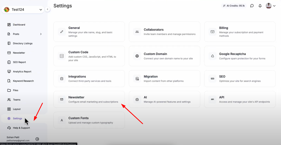 Go to your Grigora dashboard and click on "Settings" to access the configuration options. Look for "Newsletter" in the settings menu and open it to access the email configuration area.