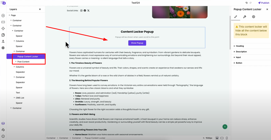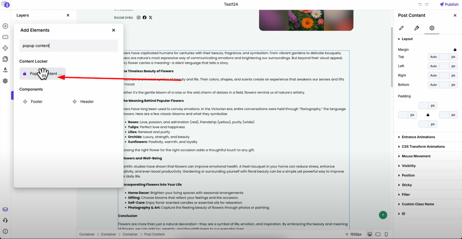 Add the popup content locker element above the post content block. This positioning ensures that the popup appears before users can access your main content, creating an effective content gate.