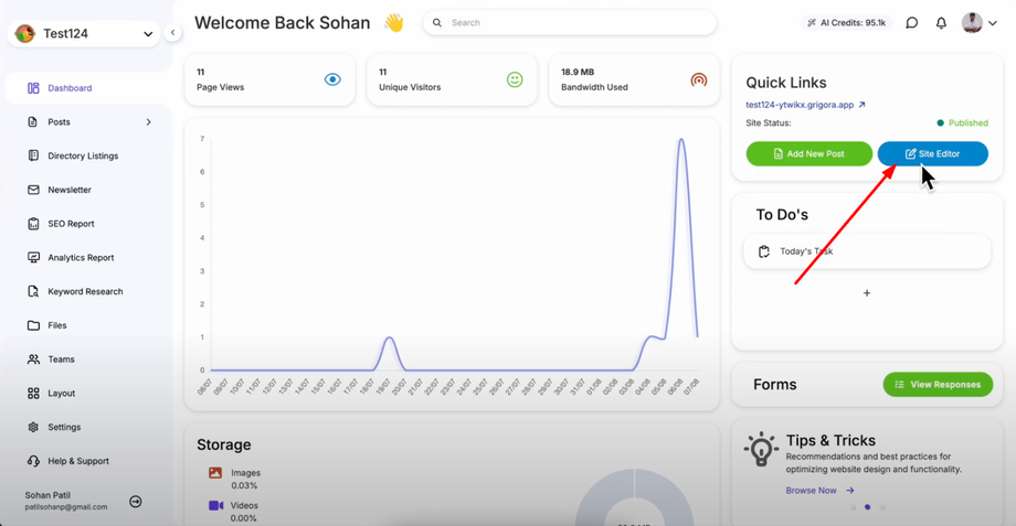 Go to your Grigora dashboard and under the quick links section, click on "Site Editor". This will take you directly to the site editor where you can modify your website's structure and content.