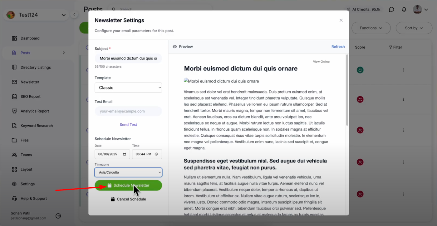 Look for the "Send Newsletter" button next to each blog post and click on this button next to the blog post you want to schedule. After clicking "Send Newsletter," the newsletter settings panel will open with various configuration options.
