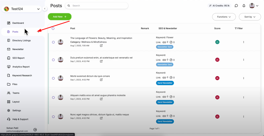 Go to your Grigora dashboard and click on "Posts" to access your blog post management area. This will show you all your published blog posts that are available to be sent as newsletters to your subscriber list.