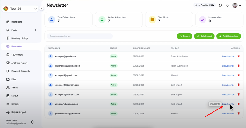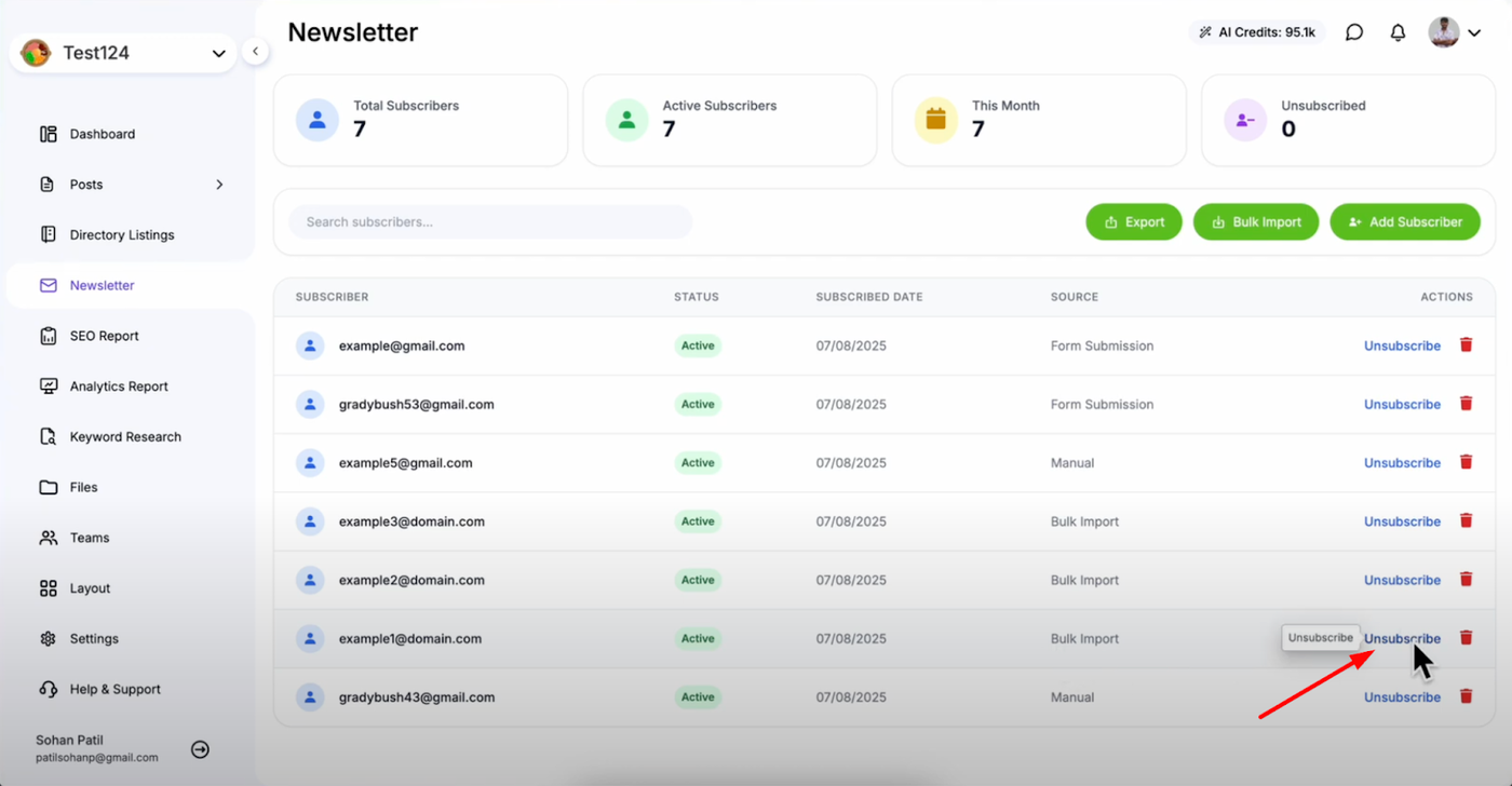 View your subscriber list where all current newsletter subscribers are displayed. Locate the subscriber you want to remove from the list and click the "Unsubscribe" button next to that subscriber's email address. The subscriber is immediately unsubscribed and will no longer receive newsletters.