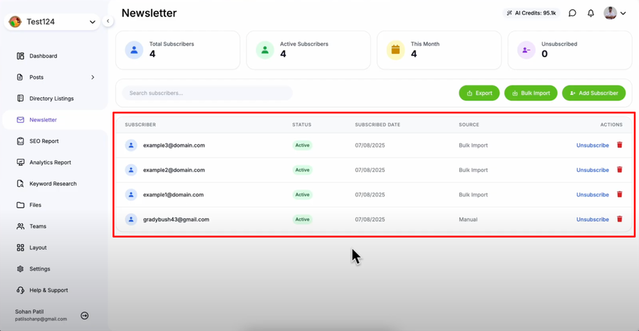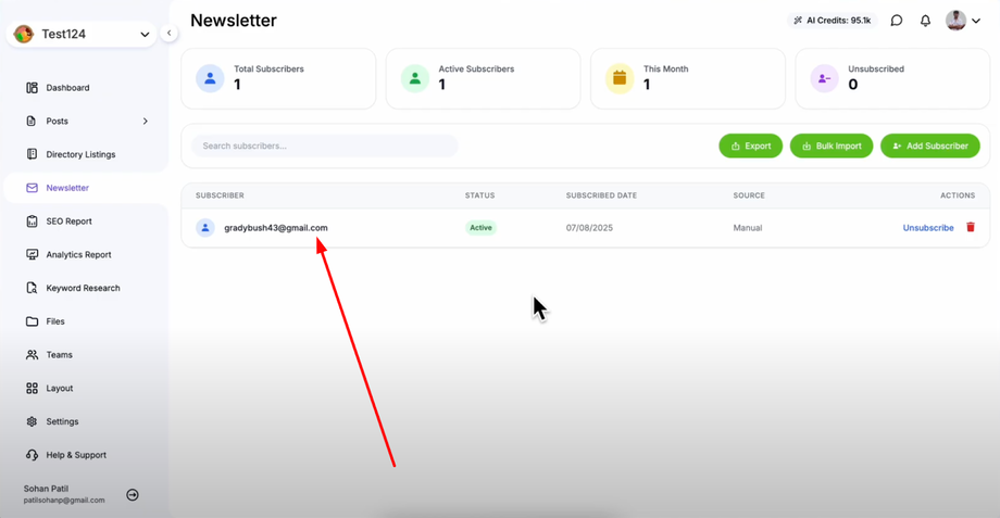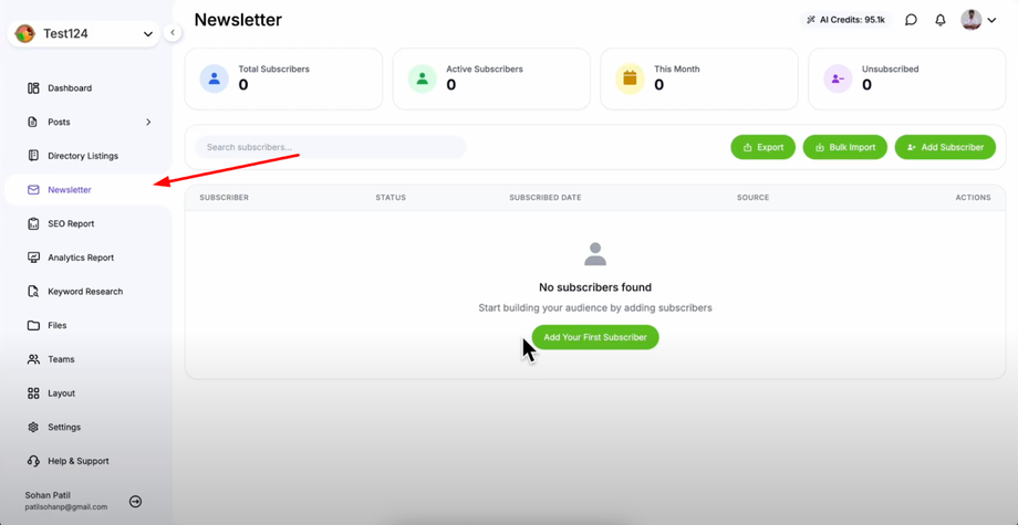 Go to your Grigora dashboard and click on "Newsletter" in the sidebar to access your newsletter management section. Once you're in the newsletter area, you'll see the subscriber management options where you can add and organize your email list.